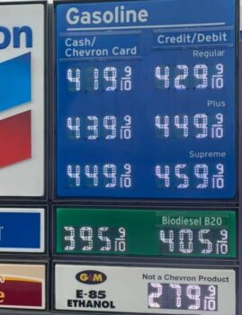 また「カーボンフリー車両」の詳細は決められていない。大手メディアによれば「電動化車両=電気自動車」としているが、eフューエルやバイオエタノールなどもカーボンフリーという考え方だってできる。中でもアメリカはトウモロコシ由来のエタノールを安価に流通させてます。右のスタンド、一番下はエタノール85%の燃料。100%にしたって3ドル少々なのでガソリンより圧倒的安価。