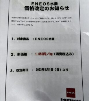 エネオス、燃料電池車の明日を閉ざす。1210円だった水素の価格を「1月1日から1650円にします」