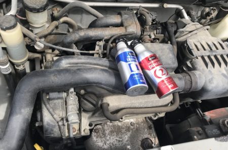 この添加剤、2液を混ぜるタイプで、素晴らしい効能を持っている。されどこんな賑やかなエンジンに入れたことなかったため、少し良くなれば100点という感覚で投入! 最初に1)と書いてある透明な添加剤を。続いて2)と書いてある乳白色の添加剤を。2)液の方、デュアルブの前身モデルと言って良いモーターレブに似た感じ。エンジン、写真のように良い感じで疲れてる。