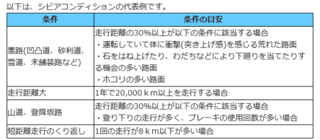 また、走行距離の30%以上が山道や登坂という使い方や、30%以上が悪路という使い方もあり得ない(後述の通り雪道はシビアでは無い)。強いて言えばⅠ回の走行が8km以下という短距離走行の繰り返しながら、これまた今の排気ガス規制のクルマで短距離走行するとオイルが劣化するほどガソリンや水分のオイル混入あるなどあり得ない。20年以上乗っているようなクルマでチョイ乗りばかりしてるなら別ですが。