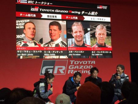 11時30分からGazooのブースでWRCのトークショー。ゲストは奴田原選手と新井選手。このメンバーじゃツマらん話にゃならんでしょう。といっても、ワラかしたつもりなんかありませんが! 私はけっこう真剣にWRCについて怪説しました。栗田嬢の上手な進行に助けられ無事済んでよかった。