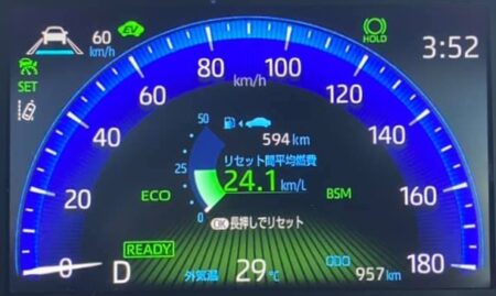 加速時はモーターのトルクをしっかり利用しているので、電気自動車みたいなすっとした走り。それも体を身構えてしまうほどのトルクではなくある程度緩やかさもありました。ドライブモードセレクトがあり、走りを楽しむ要素もしっかり入っているのがすごい! 標準状態のノーマルモード、燃費優先で滑らかな加速のエコモード、鋭い加速が得られるパワーモードの3段階がありシーンに合わせて選べるのが◎(ガソリン車はノーマルとパワーモードのみ)。