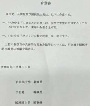 下が合意書。玉木代表は「トリガー条項でなく暫定税そのものを廃止」と考えているようだけれど、合意書を見ると「いわゆるガソリンの暫定税率」となっており”いわゆる”の解釈でどうにでもなる。暫定税そのものなら”いわゆる”無しでよかった。というか大騒ぎしたのにたったこれだけの内容。しかも永田町文学というヤツですね。果たしていつから? これに関しては全く書かれていない。