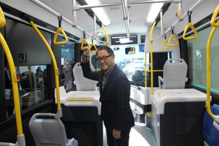 下はトヨタのブースに展示してある燃料電池バスの車内。たまたま同業者の工藤君が車内にいたら、モリゾウさんが乗ってきて楽しそうに見ていったそうな。乗り合いバス、乗ったことあるんでしょうか--と考えたものの、飛行機に乗るとき沖止めだったらバスに乗るか~。