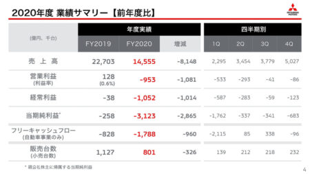 三菱自動車も少しばかり上向き。2020年度の販売台数こそ前年度のマイナス29%! 世界規模で販売台数が落ちている。三菱自動車のプレゼンスの低下を如実に感じさせます。ただ4半期毎(3ヶ月毎)の状況を見ると2020年4~6月期をソコに、少しずつ改善されていってます。長く続いた益子体勢の縮小均衡策でこれといった新型車も無いなか、検討したという評価も出来る。