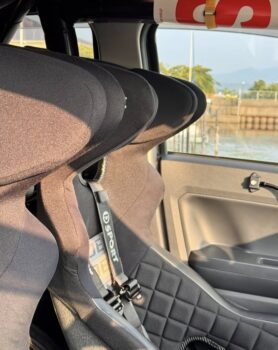 私が持っているクルマは基本的にサイド&カーテンエアバッグ付き。唯一の「無し車」がラリー車である。競技中はヘルメットを被ってるためアイアンクローをやられたってへのかっぱ。ただリエゾン中などは危険。そんなことから、レースで使うような左右に”ツノ”のあるバケットシートにしたかった。10年くらい前からBRIDEの高瀬社長にお願いし続けていた次第。