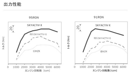 本日、正確な内容が判明しました。マツダ3のスカイアクティブXは「ハイオク推奨」ではなく「ハイオク仕様」になります。中身は95RONの欧州仕様と言うこと。もちろんレギュラーも使えるけれど、その場合は最高出力など落ちる。レギュラー使ったスカイアクティブXのトルク特性、2千回転少々をピークに、6千回転まで落ち続けます。こうなると伸び感など皆無。楽しくない。