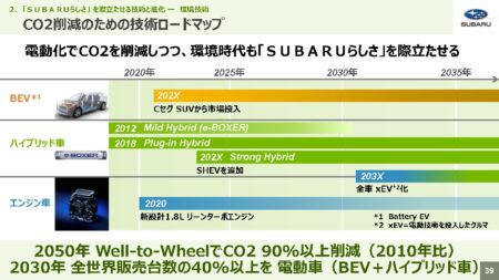下は2年前にスバルが発表した二酸化炭素削減のための商品計画。一番上がソルテラです(自社生産の電気自動車は2020年代中盤)。これを見るとストロングハイブリッドは2023年にも見えるけれど、最新の2022年情報からすればクロストレックから投入ということは考えにくい。下から上への2年間で変わったことは、自社生産の電気自動車が加わったことくらいだ。