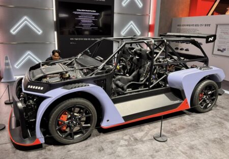 この車両、実は外観が発表される前にガンガン走っている。昨年韓国で行われたGazooとヒョンデNの共同イベントに持ち込まれ、みんなの前で派手な走りを披露。アイオニックNかと聞いたら「一回り小さいんです」。下はイベントで走った台車。アイオニックNも電気自動車じゃダントツの楽しさを実現しているが、それ以上に楽しという。ラリーなどで走らせたら相当イケるかもしれない。