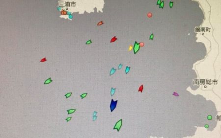 上の青が14時15分時点のダイヤモンドプリンセス。ブルーは自衛艦で、前の2つが「あきづき」「いかづち」。真後ろに「むらさめ」。少し離れて「いずも」と「ありあけ」がいる。これは偶然でしょうが。