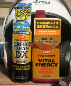 またはガソリン添加剤を入れること。一昔前のガソリン添加剤は「水抜き効果」とか「ハワーアップ」、そして「清浄剤」など用途別だった。最近のガソリン添加剤は総合ビタミン剤のように様々な機能を持たせている。左のパーフェクトクリーンという添加剤、今回のような状況にピッタリ! 満タン時に1本入れるだけでOK。ハイオク3回満タンにするよりコスト的に安いし高機能だ。