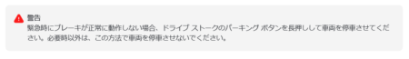 サポーターの方がテスラの緊急停止ボタンを教えてくれました。取り扱い説明書を確認したら以下の取り書いてあります。内容は「緊急時にブレーキが正常に動作しない場合、ドライブ ストークのパーキング ボタンを長押しして車両を停車させてください。必要時以外は、この方法で車両を停車させないでください」というもの。ドライブストークって何でしょう?