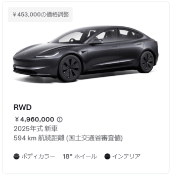 ARIYAやリーフは開店休業状態だからして8月のブランド別電気自動車販売台数でテスラがTOPになった可能性すらある(日産は9月14日時点でARIYAの台数を発表していない)。ちなみにBYDは239台。ヒョンデ75台です。なぜテスラ売れるか? 『価格調整』と称する値引きを行っているからだ。例えば496万円の「RWD」モデルだと45万3千円。