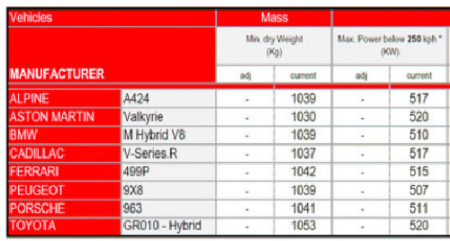 モリゾウさんが立ち上げたWRCのチームとずいぶん違う。というかル・マンのチームを見ると「モリゾウさんっぽくないですね」と感じます。ということで6度目の優勝を狙った今年だけれど、絶対的な速さが足りなかった。BoP(性能調整)は上の通りで、フェラーリより11kg重いが5kWパワフル。パワーウイエイトレシオはフェラーリと同等。ポルシェより有利である。