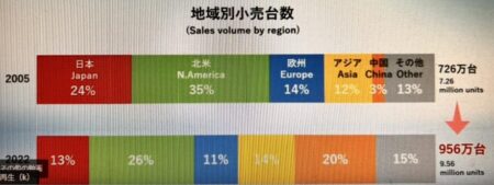 もう一つの「凄いね!」がトヨタの地域別小売り台数。ここまでバランスよく世界中の地域でクルマを売っているメーカーは少ない。大手だとトヨタとヒョンデくらいだと思う。ホンダもスバルもマツダもアメリカや中国無ければ厳しい。欧州が日本と同じくらい売れているという点に驚く。章男社長の時代、世界に通用するクルマを作れたということだろう。利益貢献度の状況も見たいもの。