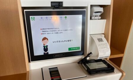 ということで使ってみた。驚くのは那覇空港から次々とバスが出ていること。待たされるレンタカー屋さんの多い中、5分間隔といってよいほど。お客さん少ないためマイクロバスに私1人。シーサイド店に到着すると受付は上のような機械。名前を入れると予約が出てくる。免許証は下の読み取り機。顔を上のカメラで確認するシステム。あっという間に書類がプリントされる。