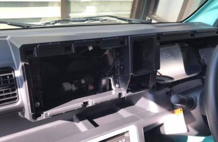 取り付けだけれど超簡単! ダッシュパネルは差し込んであるだけなので「えいやっ!」と引っ張るだけで外れる。フロントガラスの指定位置にGPSとワンセグのアンテナを貼り付け、ナビ本体にはトヨタ/ダイハツ共通の10ピンカプラーを差し込むだけ。10ピンカプラー、電源からフロントスピーカーの配線まで含まれているため、軽トラックなら他の配線不要だ。誰にでも出来る。