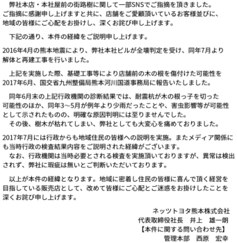 30日の朝11時過ぎにネッツ熊本からリリースが出た。上の通りです。最初に聞いた内容と同じ。この件についていえば、ネッツ熊本で完結していると思う。ちなみに他の店舗で同じような事象が起きてないか調査中とのこと。問題無ければこれで落着でしょう。初動が早くてよかった。枯れた木はクスノキ。建物の工事で枯れたなら、現状復帰すればOKだと考えます。