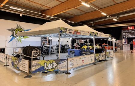 サービスパークはワークス系が屋外。みなさん専用のホスピタリー&サービストレーラーを持ってますから。プライベーターはイベントホールの中がアサインされている。私と同じクラスでこんな感じ。これくらいのスペースないとWRCに必要なアイテムが収まらない。日本は6m×6mで、それを超えると1平方mあたり7万7千円出せ、と。このスペースなら500万円掛かる。