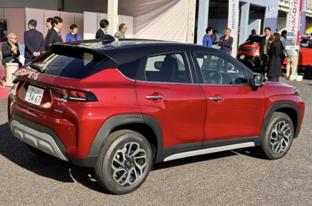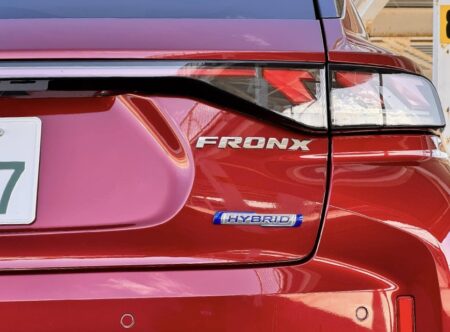 というか、日本でエンジン積むのなら、エンジンを送った方がコスト的に安い。エンジン搭載してないクルマを運送するの、エラい大変です。開発責任者は「何でそういう説明をしているのか全く解りません」。「だったら正しい情報を教えた方がいいですよ」。ということで肝心のフロンクスである。停まっているクルマを後から見たら、なんか「HYBRID」のエンブレムが右下がり。
