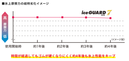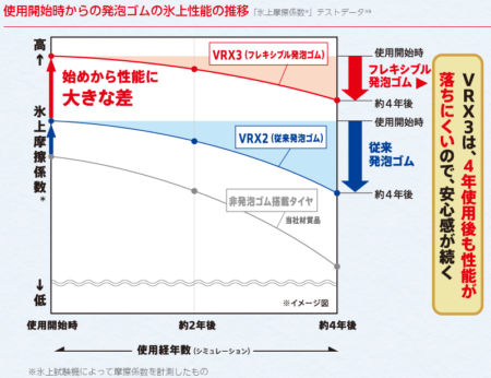 面白いことにアイスガードも同じような図表をWebに掲載してあり、2年後ならほぼ新品と同じ。4年経ってもほとんど落ち込まない。どうやら経年変化に弱いの、ブリザックのように思える。後で詳しく説明するけれど、今やブリザックもアイスガードもエックアイスも発泡ゴム(発泡ゴムと称するかどうかは別問題)。減っても違う穴が出てくるため、性能は落ちにくい。