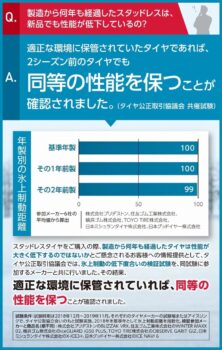 この試験の結果、2シーズン目までは大差ないということになった。しかも試験に参加したメーカーの中には経年変化でゴムが硬くなるタイプも混ざっている。ヨコハマの主張を裏付けるカタチになったと思う。おそらく5シーズンくらいなら、新品に対し最大で10%程度の性能低下に収まっているだろう。10%という差、体感出来る人なんていない。タイムアタックして差が付くレベル。