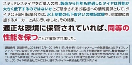 特に発泡ゴムで3年経過しても柔らかくスタッドレスタイヤとしての性能は維持されており、他社品は3シーズン目だと硬くなり安全性や信頼性がかなり落ちてました。