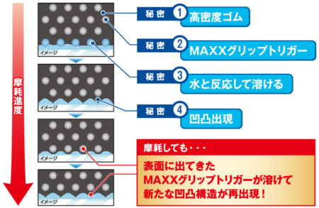 ちなみに調べてみたらダンロップの新しい世代のスタッドレスタイヤ、ウインターマックスも03から穴あきコンパウンドを採用している。MAXXグリップトリガーという素材を混ぜ込んであり、表面に出ると溶けて穴になる。まぁ事実上の発泡ゴムですね(笑い)。このコンセプトを採用した03からアイスバーン性能が格段に上がり、40%摩耗しても性能低下は少ないという。