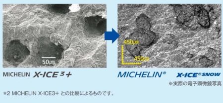 ちなみに発泡ゴムとはトレッド面に穴を作り、水を吸収する役割を果たす。今やアイスガードもトレッド面に穴がたっくさんあいており、そこで水を吸収するというブリザックと全く同じことをやっている。なんたることかエックスアイスも同じようにトレッド面は穴だらけ。つまり穴を発泡技術で作ったのか、他の方法で作ったのかの違い。だから大差ないのだった。