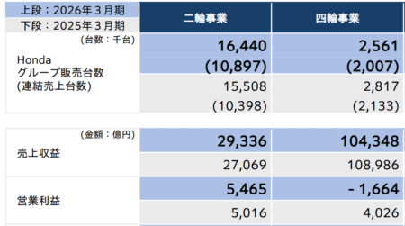 数字を紹介しておく。2025年4月~12月までの決算を見ると驚くことに4輪部門だけ見たら何と1664億円も赤字。しかも3ヶ月毎の赤字額は296億円(4~6月)。434億円(7~9月)、747億円(10~12月)に拡大中。2026年1月~3月の3ヶ月の赤字予想といえば、2800億円規模! 何と12ヶ月だと4500億円もの赤字ということになる。上の-1664が-4500になるワケ。