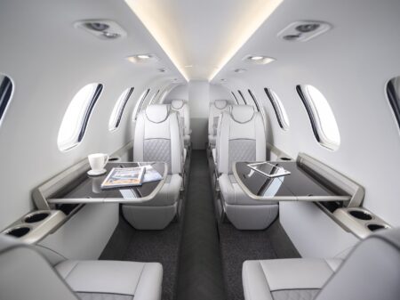 最高巡航速度も782kmから834kmに上がり、最大運用高度は13106mから14326mまで上がれる。わかりやすく説明すると、アメリカだったら西海岸から東海岸までノンストップ&B737と同じくらいの速度を出せ、エアラインより気流が安定した高高度を飛べるということになります。このカテゴリーで最も売れているセスナ・サイテーションXLS(下の写真)より高い性能を持つ。