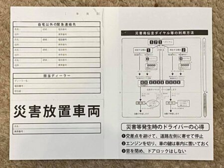 確かに私も自分のクルマにはサイバイバルキットを常時積んである。されど広報車に乗せ替えるまでやってない。広報にお願いし、どんな内容なのかチェックしてみました。最初に「そうだよな~!」と思ったのが下のシート。クルマを置いて逃げるような時は、この手の情報を絶対必要。なかでも「災害発生時のドライバーの心得」についちゃ「その通り!」とヒザを打つ!