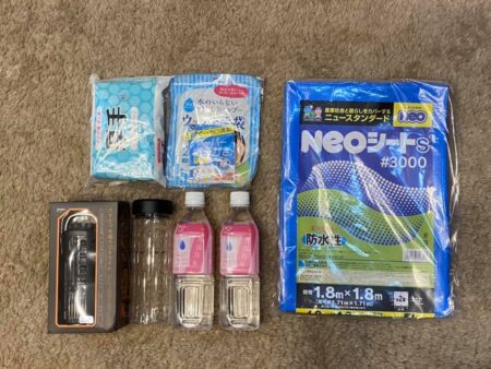 入っているモノは1~2泊のサイバイバルを対象としたスペック。ある程度気温が低くなっても何とか過ごせ、食糧や水を入手出来なくても1日くらい何とか過ごせるというもの。下は7年保存可能な500ccの水2本と、水を貰うための水筒。そして1,8m四方のビニールシート。ビニールシート、雨や寒さを防ぐ素晴らしい仕事をしてくれます。上手に作ればテントのようにもなる。