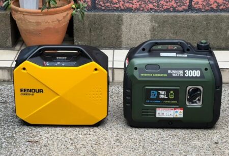 1300Wのタイプを使ってみた。何より取り扱いが面倒なガソリンじゃないという点で素晴らしい! ガソリン、少し漏れただけで臭いますから。ボンベ2本でフル出力50分。キャンプでホットプレート使うような定格4分の1だと80分持つ。ボンベ1本140円くらいだから、晩ご飯の燃料代280円。ガソリンより割高ながら、使用頻度の少ないアウトドアや非常用ならベストだと思う。