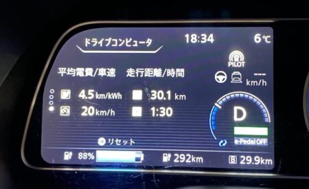 本日の移動の足はリーフe+。雨で気温低い日は電気自動車にとって最も厳しいコンディション。寒いだけならガマン出来るが、雨降ると除湿しなければならない。となるとイヤでも「全部ON」になってしまう。結果、都内を30km走って電費4.5km/kWh。容量62kWhのe+で安心して使える容量は50kWh程度。航続距離225kmということになる。都内なら11時間走れますけど。