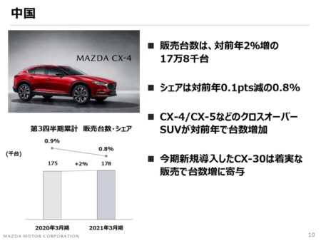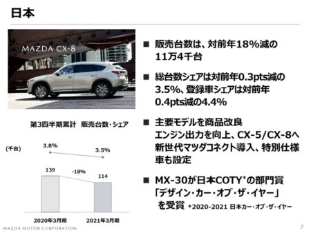 そして日本。大きくシェアを落としている。直近1月の販売台数順位を見ても、一番売れているCX-30で21位。CX-5は29位。本来なら新車効果で販売台数多いはずのMX-30が833台で47位。ちなみに46位がレクサスUX250。48位エクリプスクロスです。2021年3月期決算の赤字予想額は少し減少したものの、株価がストップ高になるほどのパンチ力無し。さて。株価上昇の要因はなんでしょ?