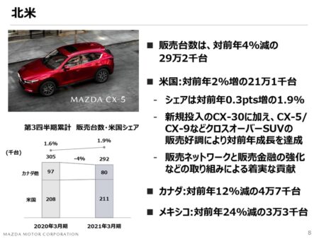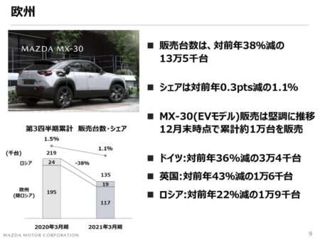 厳しいのが欧州。38%という販売減もさることながら、マーケットシェアを1,5%から1,1%に落としているのが決定的に厳しい。昨日トヨタの大躍進を紹介したけれど、対象的です。売れない理由は明白でCAFE2021年対応が大失敗したからだ。その気になって売ればもう少し伸びるポテンシャルを持っているけれど、売ったら高額なCAFEの罰則金を支払わされる。当面厳しい。