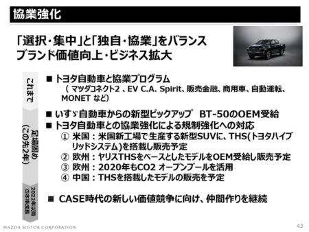 2つ目の「へぇ!」はトヨタとの協業内容。アメリカとヨーロッパと中国でトヨタからハイブリッド車のOEMを受けるという。なんと! スカイアクティブXの発売時点は自力でCAFEをクリアすると言ってたのに断念したようだ。数年前、マツダのパワーユニット戦略をやっていた人に何度このあたりの計画を聞いたけれど「出来る!」と自信満々だったのに。
