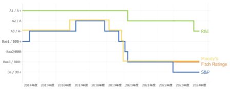 格付け会社は無責任に評価しているのではないし、気分でもない。間違った情報を流すと信用されなくなるため、専門家が分析してる。下を見ると、2019年度からドンドン落ちている。6日前にムーディーズがBa1(投資不適格)に落とし、さらに昨日フィッチがBB+(ジャンク債)に引き下げた。A+を付けているのは日本の格付投資情報センターだけ。こうなると日産の債権、誰も買わない。