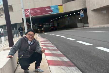 走行前、豊田章男さんから話を聞く機会があった。下のような写真を見たので「もしや?」と思ったら、やはりモナコに来るのは初めてだったそうな! というのもこの写真、クルマ好きが初めてモナコにやってきたら、必ず撮る! ココか、ロウズヘアピンです。普段、自ら「基本はただのクルマ好きのオジサン」と言うモリゾウさんながら、その通りなのね、と改めて思った。