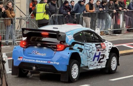 そうそう。水素エンジンのラリー2をSSのコースで走らせると聞いていたけれど、ドライバーは豊田章男さんでした! SS13ってF1モンテカルロで使われる後半のコース。SS直前の観客テンコ盛りだったタイミングで水素エンジンの全開走行音を響かせましたね。環境対応技術、基本的には音が出ない。モータースポーツって音も魅力の一つ。水素エンジンなら二酸化炭素出さず&エンジンを楽しめる。