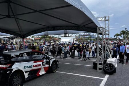 いやいや驚きました。那覇のイーアスというショッピングモールの駐車場でGazooのイベントが行われたのだけれど、何と1万1千人も集まったのである。イベントの内容はラリー1車両やドリフト車などを走らせるというものなのだけれど、正直、ここまでの規模になるとは予想もしていなかった。人気はやはりモリゾウさんですね。会場に登場するや、こんな感じ。