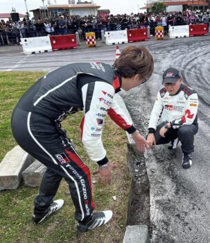 すでに遅し。大いに観客を沸かせたデモランだったけれど、やはりターンインの荷重が乗らず乗りにくそう。それでも果敢に攻めたら、少しリアがルースになって縁石を蹴る。まぁWRCだったら日常茶飯事。けっこう大きい縁石だったものの、アームが曲がることも無し! WRカーって丈夫だ。かくしてモリゾウさんが縁石を蹴り飛ばしたコーナーに名前がつきましたさ(笑)。
