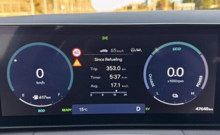 こう書くと「日本以外のハイブリッドなんて燃費悪いしスムースじゃないし」と思うだろう。驚くべきは燃費! 高速道路を主体に(といっても韓国は90~105km/h程度)353km走って17.1km/L! 1900kg程度である空気抵抗大きいSUVということを考えれば燃費良い。353km走って残走行可能距離617kmも凄い。実用燃費でも14km/Lくらい走ってくれると思う。レギュラーガスです。
