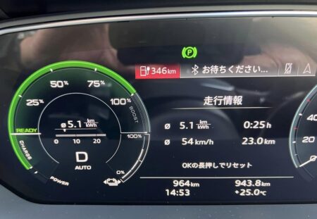 電費は悪い。クルコンを90km/hにセットして5.1km/kWh。面白いコトに気を使わずに走っても4.5km/kWhくらい走る。ただ150km走ったら30kWhも使う。家庭用の3kW充電だと10時間! 夜だけじゃ満充電にならない。電費の悪い電気自動車は、自宅に6kWの充電器が必要になってきますね。いずれにしろ車両価格を考えたら普通の人は買わないでしょうね。