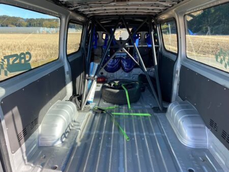 ちなみにリアのラゲッジスペースはこ~んな感じ。テーブルとイスでも置いておけばコーヒー飲める。自転車はもちろんバイクだって運べるだろう(登録上は350kg積み)。ハイエース買ってラリーカーにする人はいないだろうけれど、普通のハイエースにこのサスペンションを組んだら最高のミニバンになってくれる。どうやら来年の春くらいに市販パーツを出すようだ。