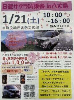 そんな八丈島でSAKURAの試乗会を開催するという。いろんなことその1は、すでにSAKURAのバックオーダーって1年以上だと言われている。八丈島で試乗会を行ってまで販促活動をする意味があるんだろうか? というのもフェリーの往来の無い八丈島までクルマを運ぶのはけっこう大変。金額こそ片道3万円程度ながら、週2便しかなく、しかもこの時期は荒れるため運休多い。往復で20日間くらい見ておかないとアカンのだった。