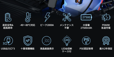 2年間くらい放置しても放電しないというあたりも心強い。何よりスペックを考えたらら安い。USB出力付きだからノートパソコンの電源としても使えるし。寒冷地や、ウインタースポーツ好き、ランクルなんか乗っている人なら持っておくと安心だと思う。オイルが硬くなるような寒冷地でディーゼルエンジンのバッテリー上がったら、このくらいのスペックを持ってないと心配です。