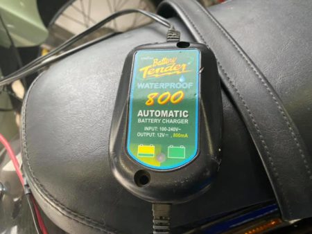 セルモーターのパワー足りないハーレーは少し乗らないだけですぐ始動出来なくなる。常にビンビン好きって多いらしく、対策として下のようなバッテリーチャージャーを常時付けている人が多い。私のハーレー(息子から引き取った)も『バッテリーテンダー』という1万5千円くらいするチャージャーを使っていた。けれど私のが不良品なのか、あんまり役に立たぬ(私と同じ)。