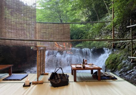 どんな場所も行ける! 晩ご飯は貴船神社の右源太。右源太家は元々貴船神社の神職で、90年前から宿と茶店を始めたという。私にとって「死ぬまで1度は味わってみたかった」川床料理は貴船が発祥の地と言われてます。いつもなら予約取れないですよ。昼間33度だった京都ながら、川床に降りたら18度! 長袖でも寒い(上着を貸してくれます)。